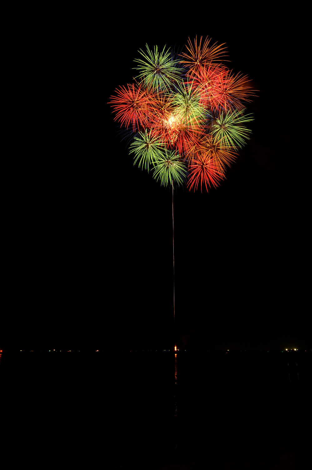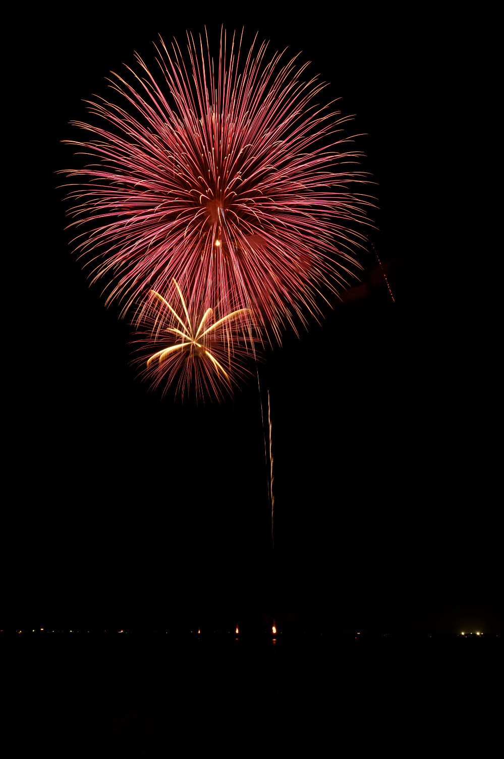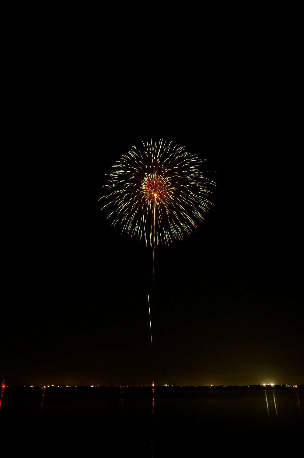 友人と弟と3人で観覧 15時位に場所取りに行くが拍子抜け。 全く余裕。17時以降でやっとパラパラ観客が現れる。 観覧エリアはL字に成っており、波止場からの打上。 L字のエリアは何所でも良く見える。私は 風向きを考慮し奥の方へ。奥の方が二尺玉の 打上エリアから近い。 開始1時間程前に自転車で10分位の コンビニで食料調達。 残念ながら近くに店は無い。的屋は 利用しないので論外。 花火は大玉が比較的多く、単発打上げとすターマインが 順繰りで上がる。 目玉は二尺の千輪と最後の千輪。 地方の大会で二尺玉が2発上がるのは立派だが もう少し集客の良い内容にしてもらいたい。 昨年は雨天順延の為(しかも開始前は小雨) 4万人と例年の半分程度。 例年8万人位の人出が有ったと思うが、近隣の市の 花火大会と重なり(桑名と)、魅力はそんなに無いが、 地元なので毎年意地でもと行っている。 と辛口だが、良い点もある。海上自爆である。 観覧席間際から船による投げ込み。 例年近過ぎて腰を抜かす迫力だったが、保安距離か、 安全面、苦情等からもう少し離れた位置からの投げ込と 替わっていた。 海花火の魅力として、海面への花火の写り込みが有る。 尺玉が多く、打上場所も観覧席から近く、迫力は楽しめる。 スターマインは余り宜しくは無いが、大玉を堪能する 花火と割り切れば中々良い。 港の為、近隣の花火が2〜3箇所例年見れます。 個人的には日程をばらけて(日曜開催とか) 近隣の花火が同日と言うのが無ければ嬉しですね。 花火会場の課題としてゴミ問題が有る。 花火後はっきり言って10m歩く間に何かを蹴飛ばす勢い。 ゴミの収集もせず単に持ち帰ってくれと言うのみ。 正直これでは捨てる人が多いのは仕方が無い。 本来的屋が集めたり、本部付近等にゴミの集積所を作り そこに捨ててもらうのが一番。そうした方が翌日の清掃費用が 少ないと思う。 また会場にてプログラムの配布なし。広報誌に有る プログラムのみ。これはいただけません。 この日は新調したトキナーの超広角レンズ12-24mmの お試し撮影でもある。 来るべき長岡、熊野に合わせて特性を掴むのが主眼だった。 | カメラ:ニコンD2X レンズ::シグマ18-50mm トキナ12-24mm ピント:マニュアル 露出:マニュアル 露出はバルブにて |